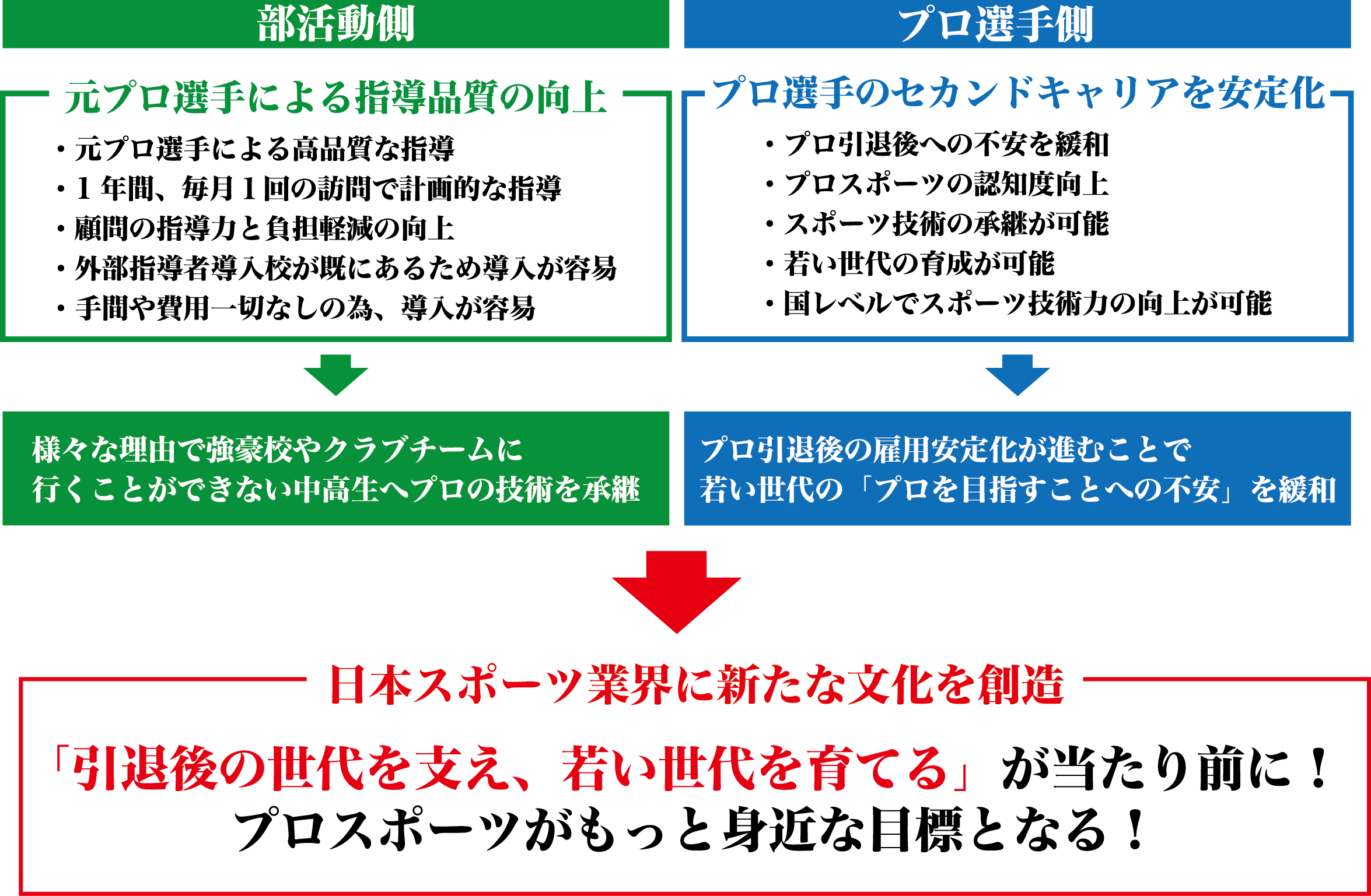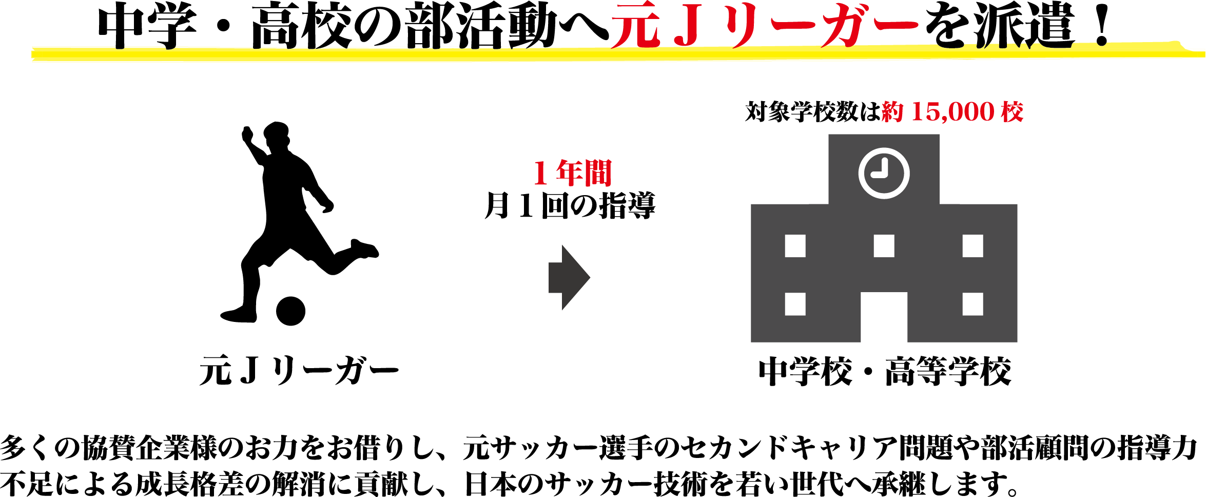 当機構では、元サッカー選手のセカンドキャリア問題や部活顧問の指導力不足による成長格差の解消に貢献し、日本のサッカー技術を若い世代へ継承するためのプロジェクトを行っております。